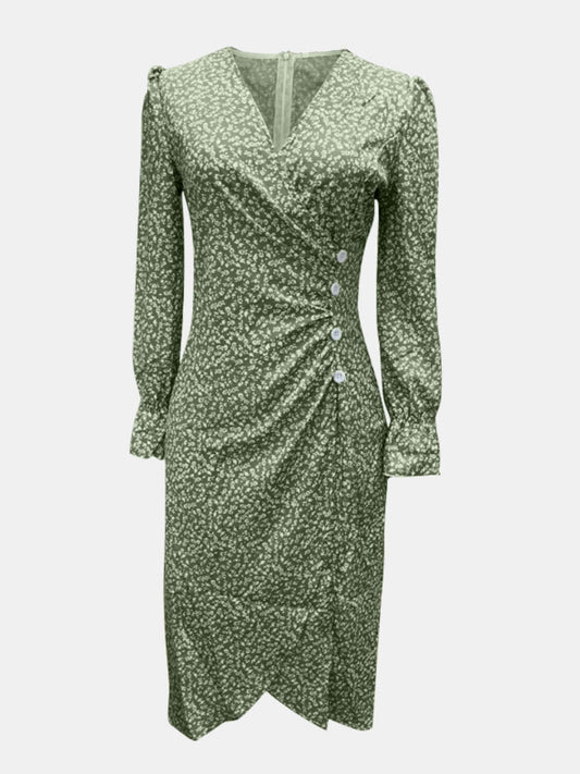 Full Size Printed Surplice Long Sleeve Midi Dress