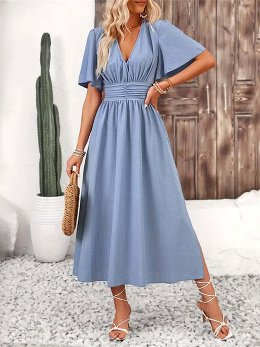 Side Slit Surplice Flutter Sleeve Midi Dress