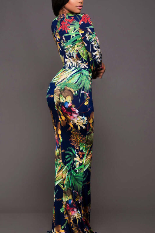 Printed Plunge Neck Flounce Sleeve Mini Dress