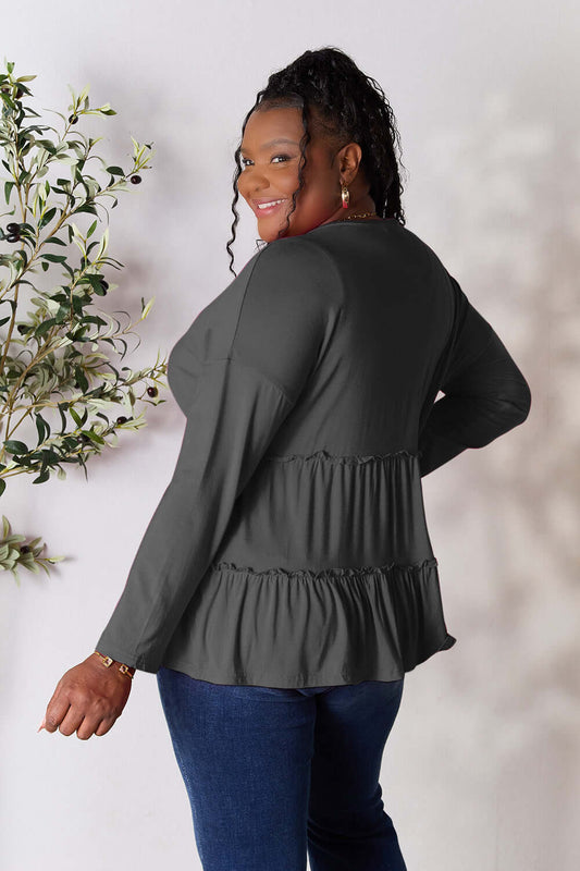 Double Take Half Button Long Sleeve Ruffle Hem Blouse